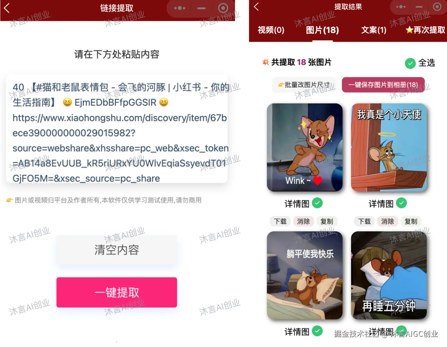 打开搜索到的任意一篇笔记,直接保存的表情是有水印的,我们可以获取笔记链接后,使用工具一键提取所有无水印表情包(文末领取)