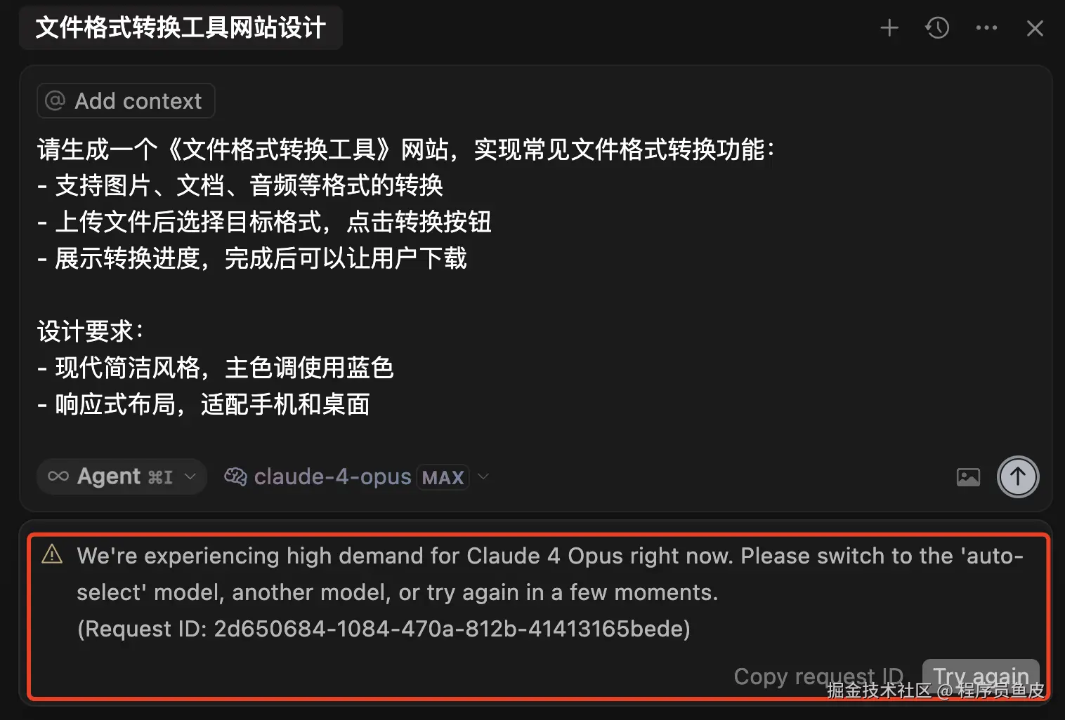 等待一段时间后,就可以看到生成的效果了。比较坑的一点是,目前 Claude 4 Opus 模型过于火爆,一直提示说使用的人太多。。。本来我昨天就想发教程了,但就是卡在这一步,直到今天早上 8 点多才能正常使用。