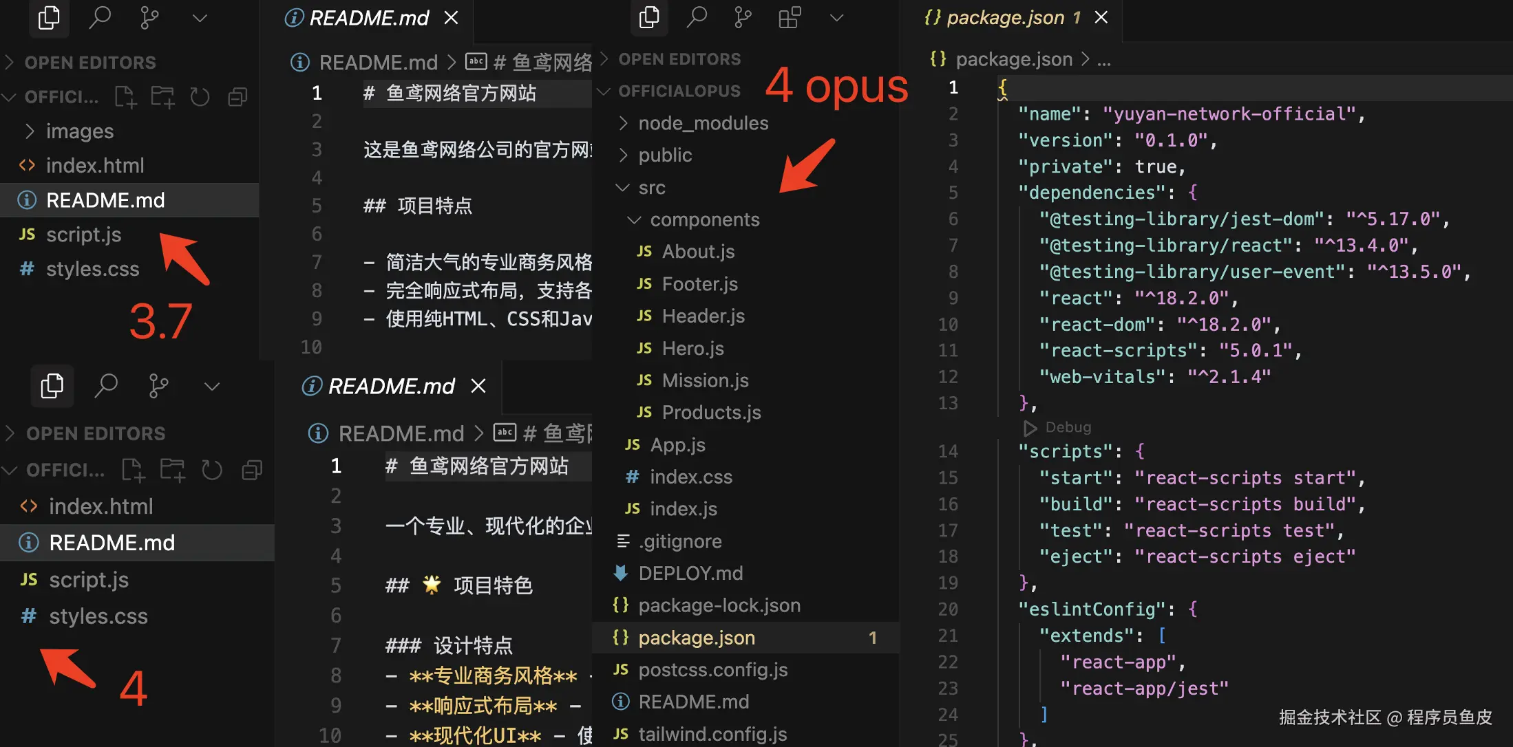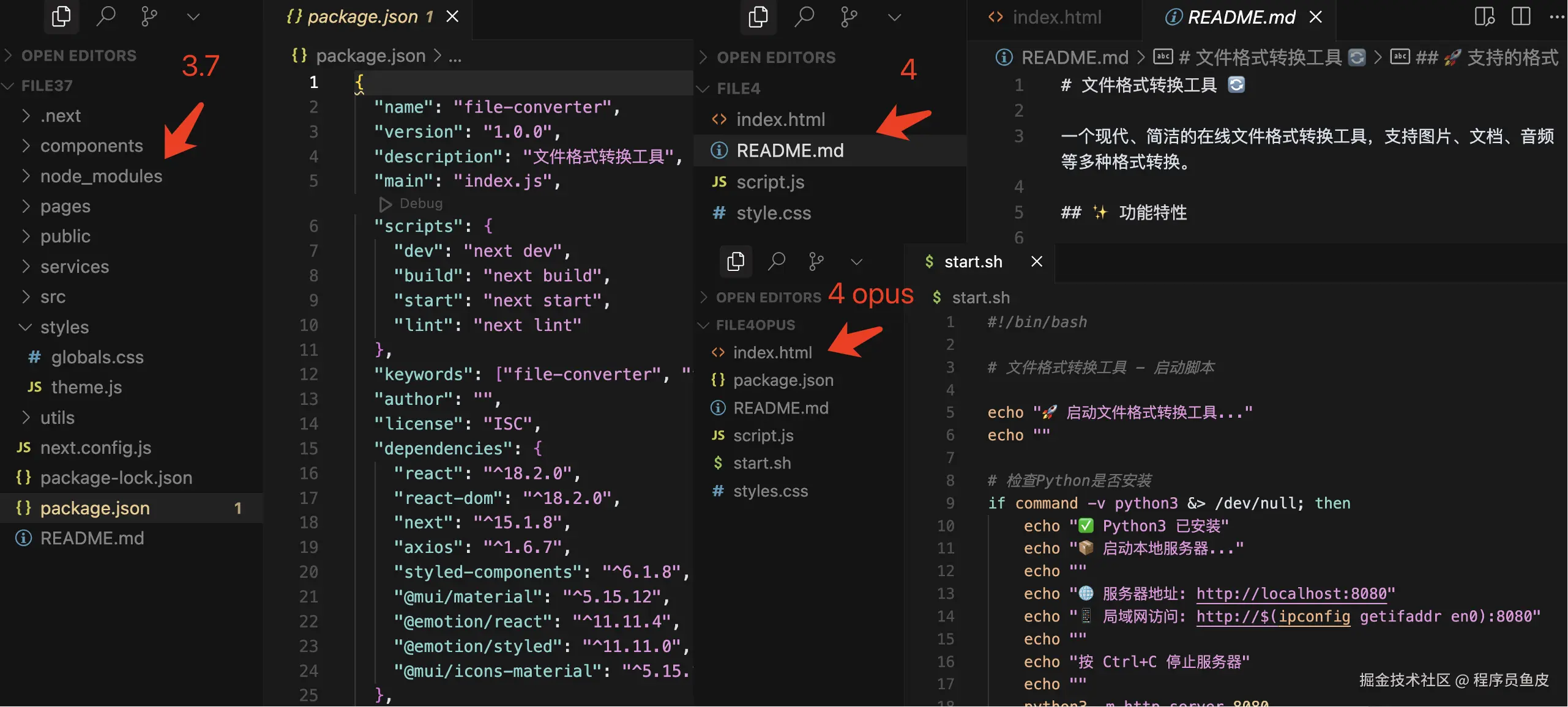 这次的生成结果可就有意思了,claude-3.7-sonnet 和 claude-4-sonnet 直接使用最基础的前端三件套(HTML + CSS + JavaScript)完成了项目,而 claude-4-opus 却使用了 React 前端框架技术来生成代码,并且把一个简单的页面拆分成了很多个小组件。