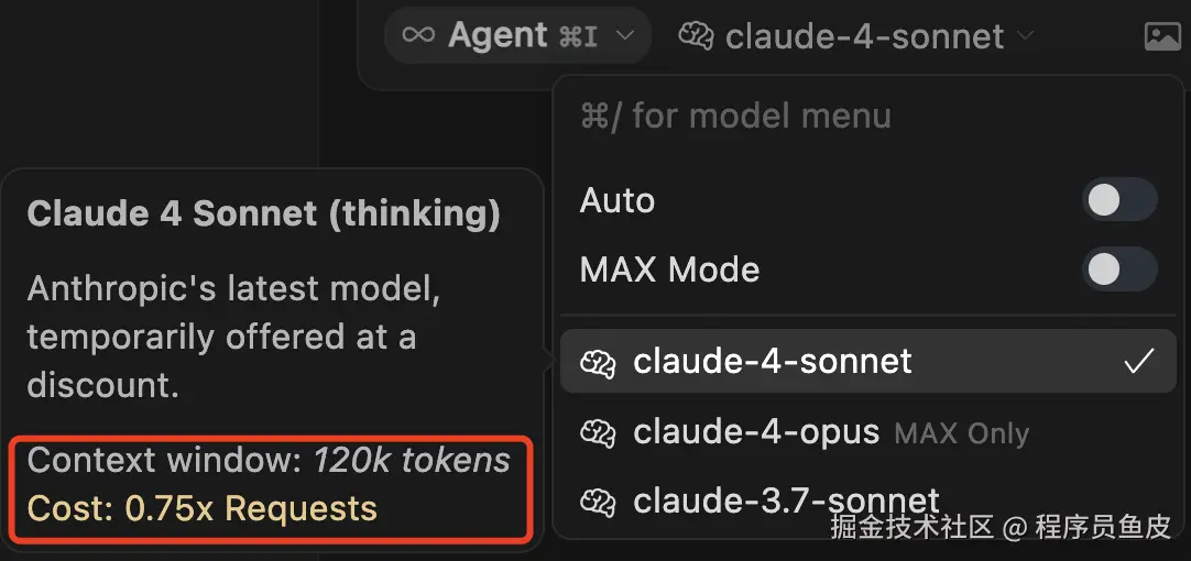 对了,还得提醒一下,目前使用 claude 4 系列模型是按照 token 计费的,Claude 官方给出的价格是 Opus 4 每百万 token 15/75美元(输入/输出),Sonnet 4 为 3/15 美元。而在 Cursor 中使用 Opus 4 是按 token 计费,使用 Sonnet 4(非 MAX 版本)是按照请求数计费,目前还有 75 折,一个请求大概是 0.04 美元。