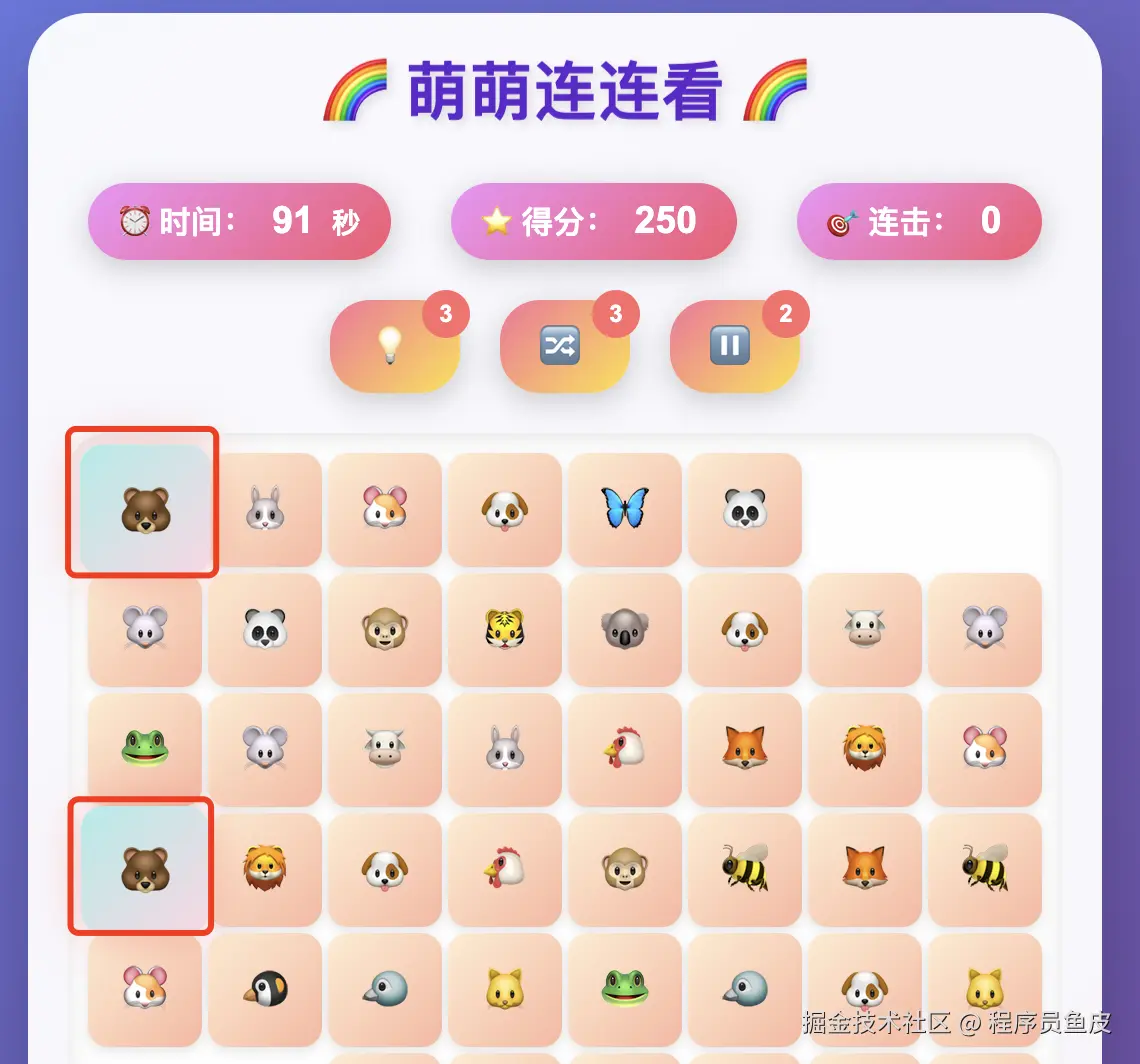 所有模型生成的游戏都是能正常操作的,可以消除图案相同的方块,也可以使用提示、洗牌、停止计时、炸弹等道具。但是 AI 对连连看游戏的理解好像有点问题,比如下面这种情况,我记得是能消除的吧?但是生成的游戏无法顺利消除。。。