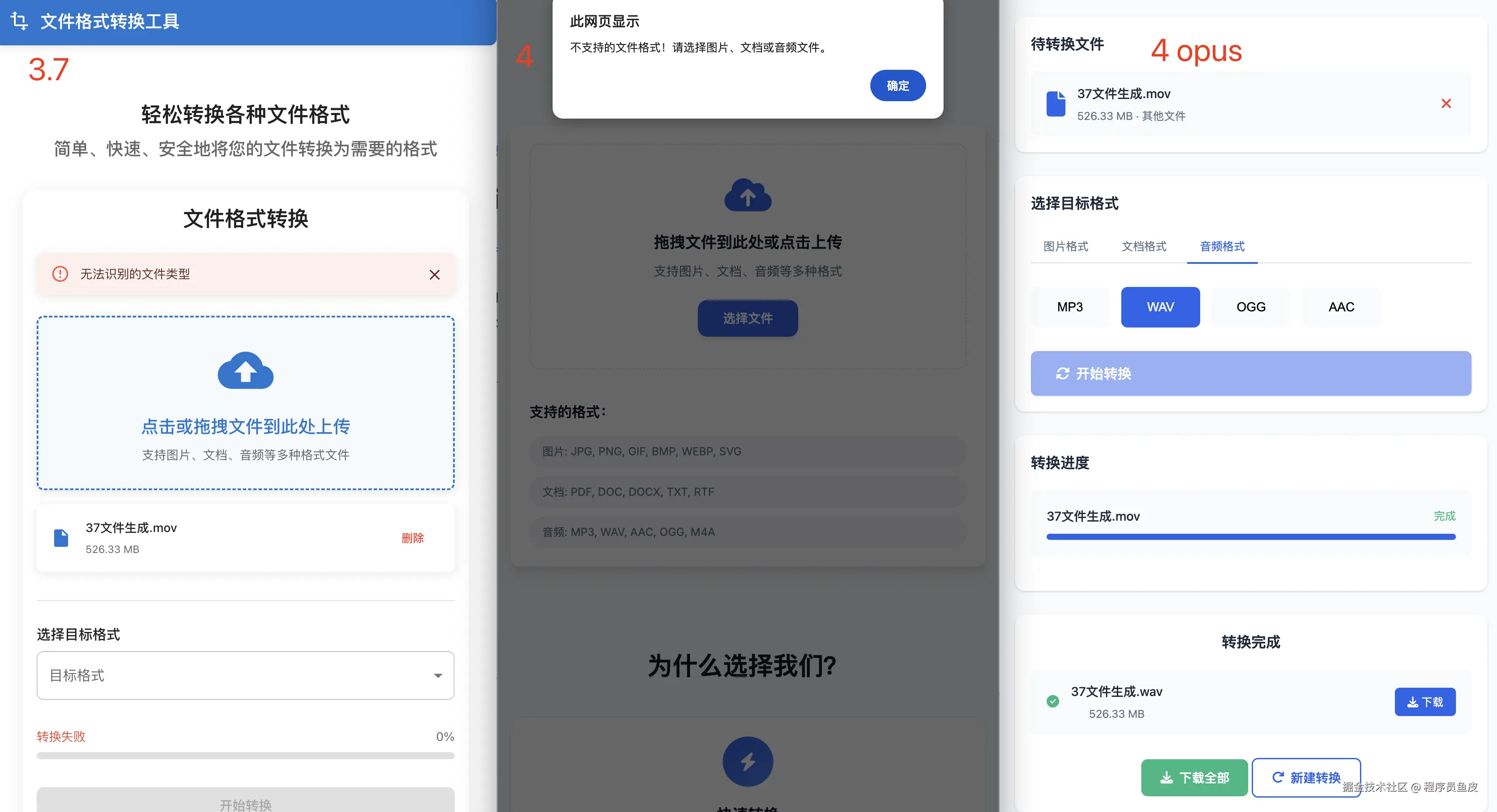 有意思的是,如果我上传一个不支持的格式,claude-3.7-sonnet 会给出弱弱的警告;claude-4-sonnet 会给出更强力的弹窗警告;而 claude-4-opus 可以说是死鸭子嘴硬,我可以继续选择转换格式,它也装作能处理的样子,还给我提示转换成功。