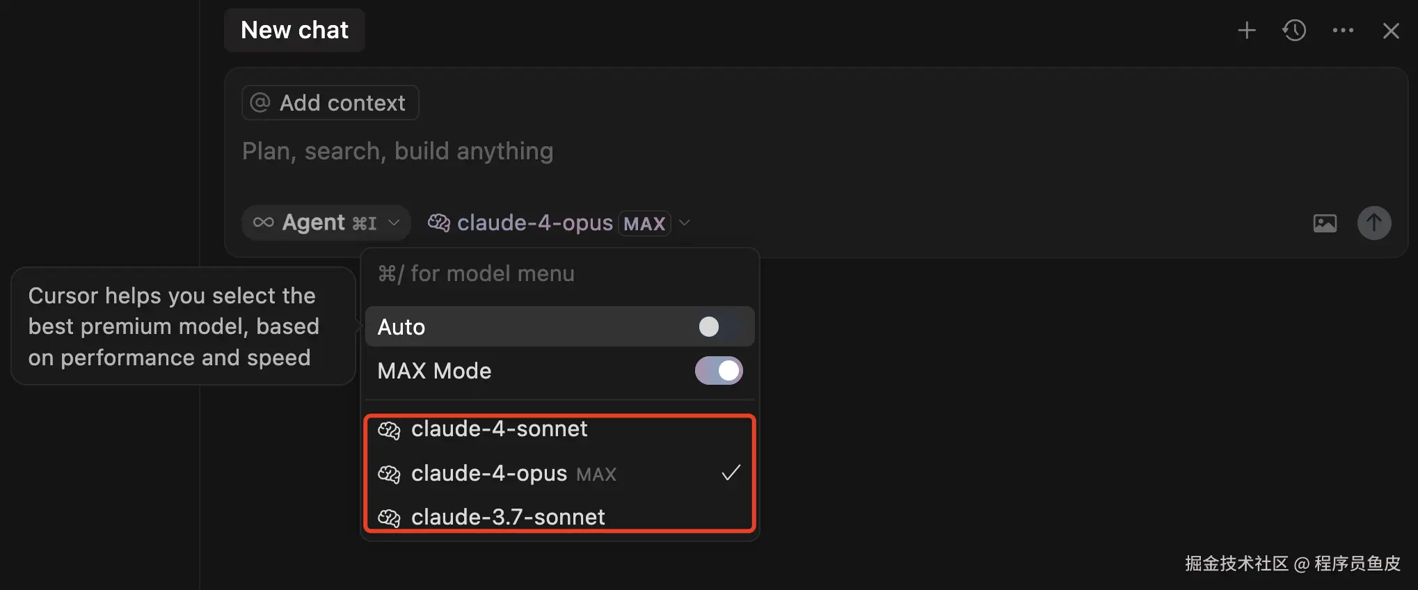 在 Cursor 中选择对应的大模型、以及 Agent 智能体模式,然后执行 Prompt: