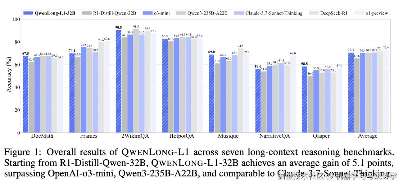 在七个长上下文文档问答基准测试上的实验表明,QwenLong - L1 - 32B 优于 OpenAI - o3 - mini 和 Qwen3 - 235B - A22B 等旗舰大推理模型,性能与 Claude - 3.7 - Sonnet - Thinking 相当,在当前最先进的大推理模型中表现领先。