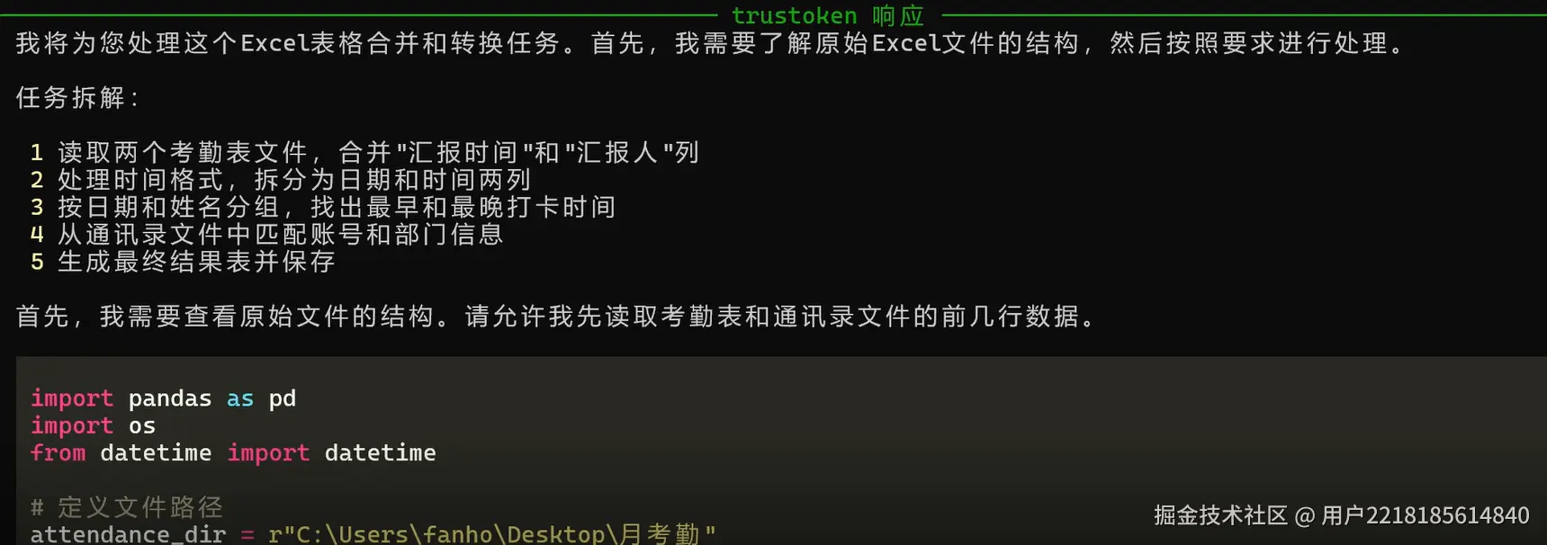 - 一键锁定关键时间点🔍: 以前找每个人的最早最晚打卡时间,要在 Excel 里翻来覆去找半天。现在 AiPy工具自动提取,还按部门分类汇总,迟到早退一目了然!