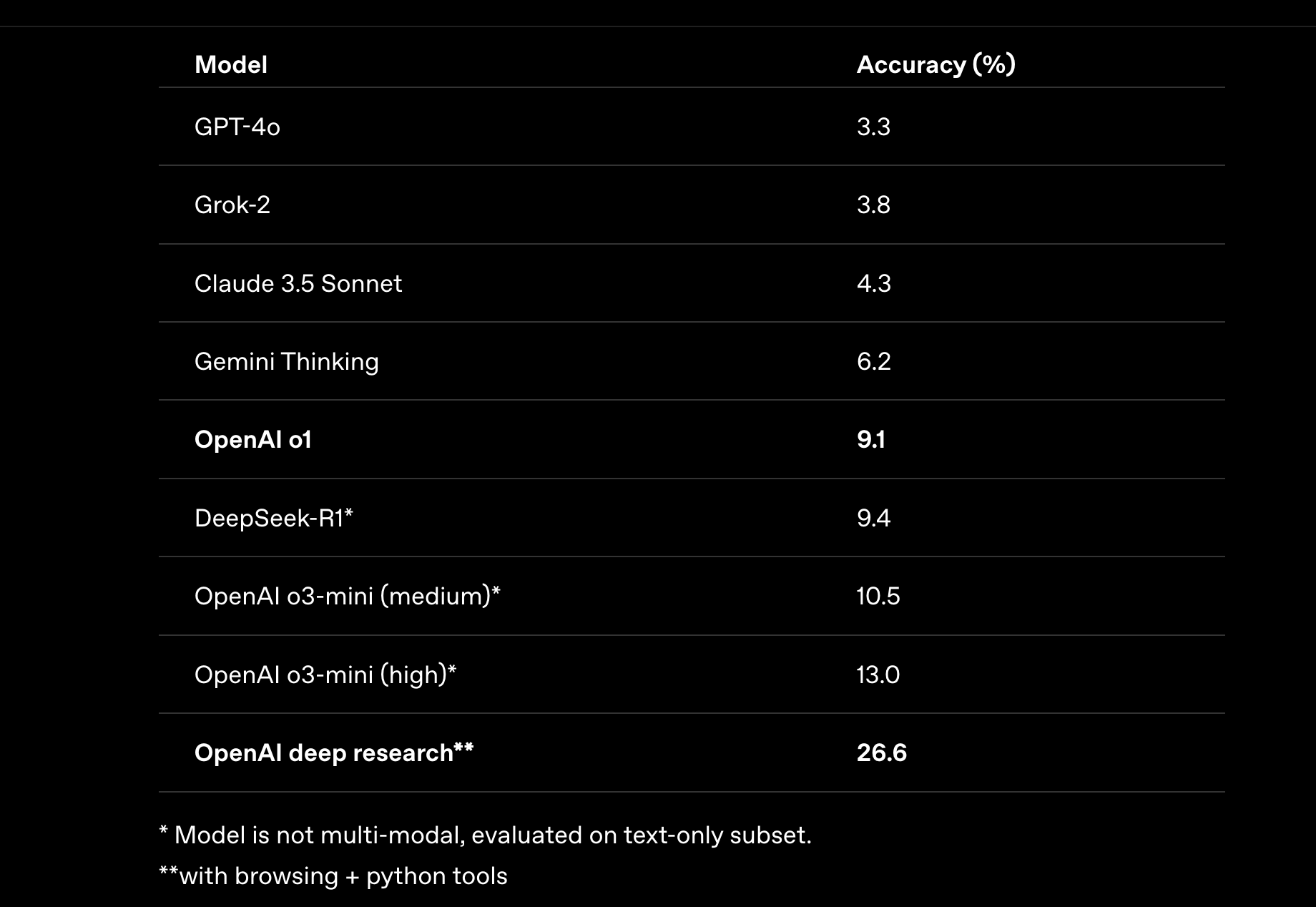 表现:人类终极考试,准确率突破 26.6%。这项测试包括3000多个多项选择题和简答题,涵盖从语言学到火箭科学 、古典文学到生态学的100多个学科。