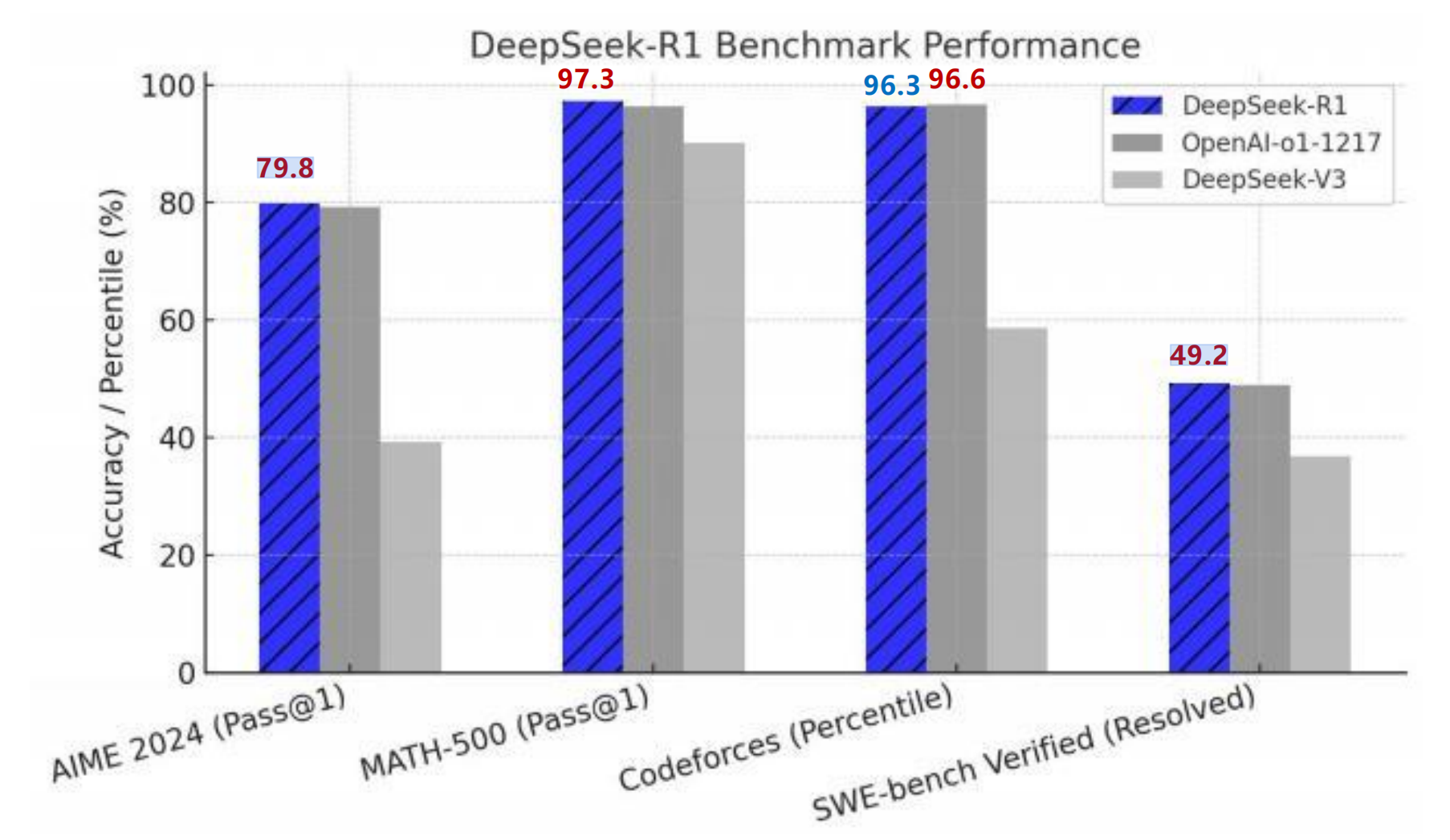 数学推理能力对标顶尖模型:DeepSeek R1 在 AIME 2024 基准测试中得分 79.8%( pass@1 ),略优于 OpenAI-o1-1217;在 MATH-500 测试中,取得 97.3%,表现与 OpenAI-o1-1217 相当,远超其他模型。