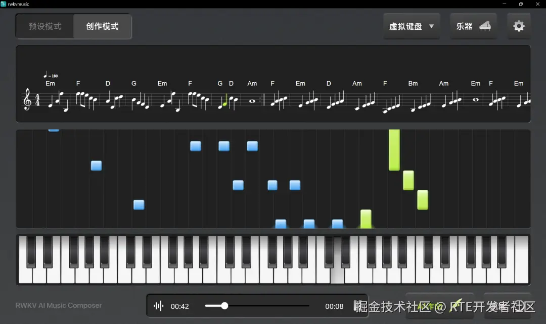 在展会上元始智能还展示了 RWKV 作曲家(RWKV Music),一款基于 RWKV 大模型的 AI 作曲应用。依托端侧算力,无需联网。静谧的山林或喧嚣的都市,只要灵感闪现,就能一键捕捉。此次 RWKV 作曲家全新升级,可修改单一音符时值,旋律随机律动,让交互更加个性化。