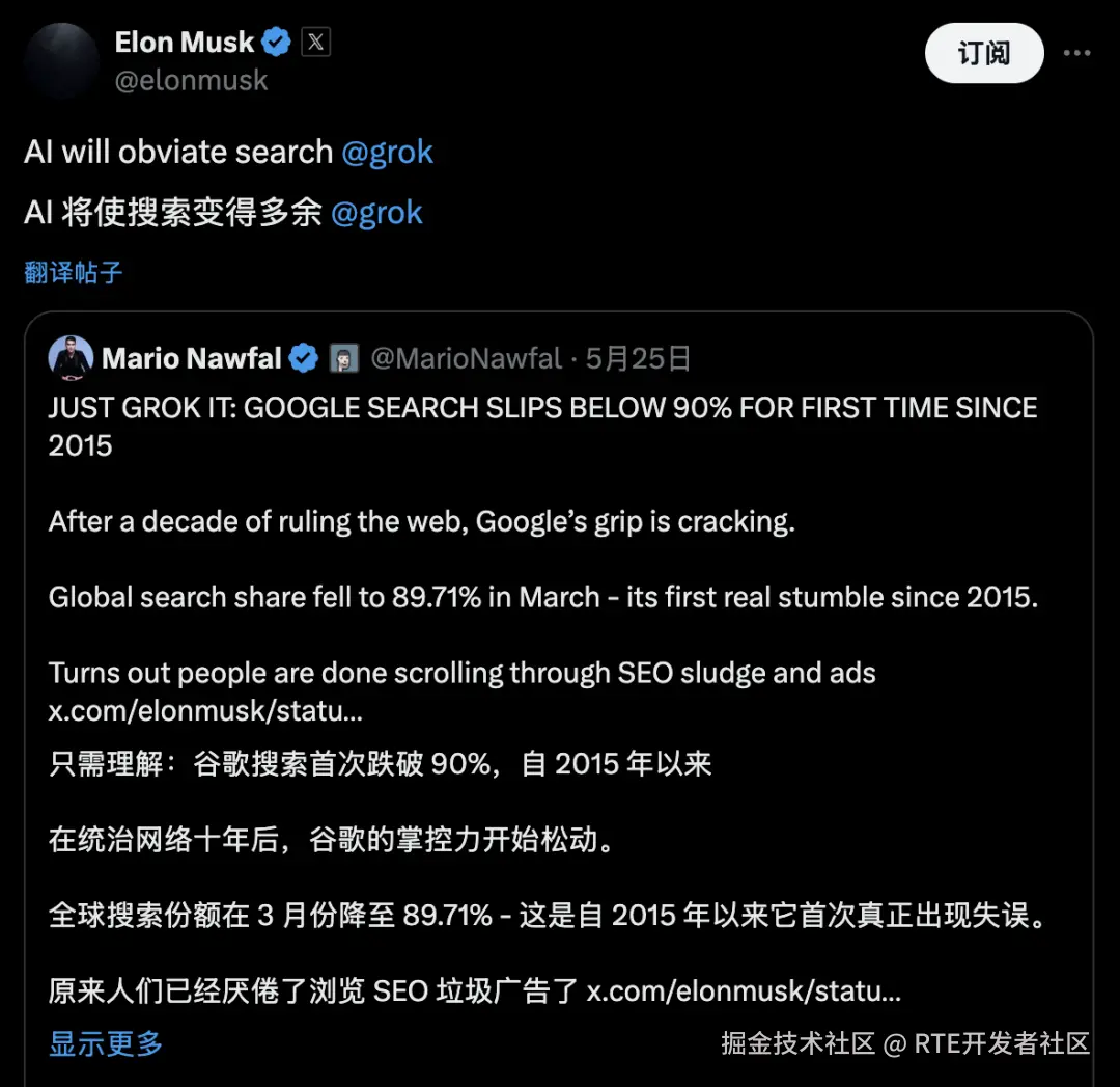 昨日,马斯克在个人社交账号上转发了一份关于全球搜索引擎份额的报告,其配文「AI 将替代搜索」,并 @ 了自家 xAI 旗下的 AI 聊天机器人 Grok。