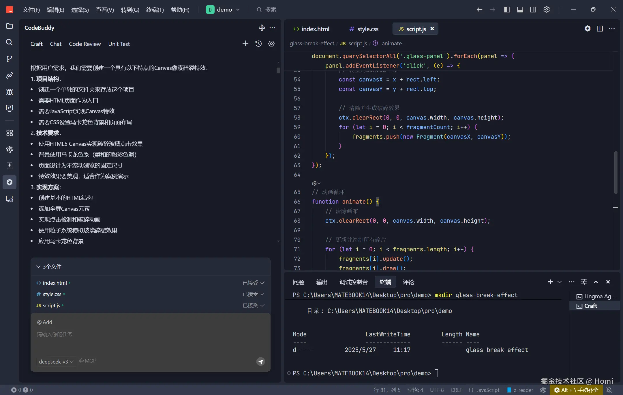 在一个项目中,我需要为网页添加一个玻璃破碎的动画效果,以增强用户的交互体验。然而,实现这样一个复杂的动画效果并非易事,需要考虑到物理模拟、图形绘制等多个方面的知识。面对这个挑战,我决定借助AI的力量来完成这个任务。