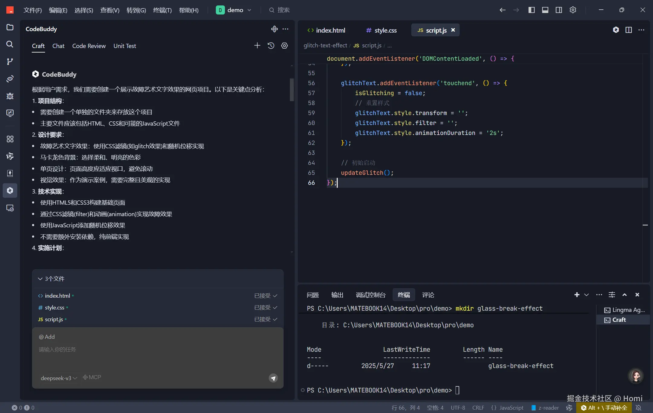 通过与AI的交流和合作,成功地实现了故障艺术风格的文字效果。在这个过程中,深刻体会到了AI在技术开发中的巨大作用。AI不仅能够提供代码示例,还能详细解释代码的原理和实现思路,帮助开发者更快地掌握新技术。