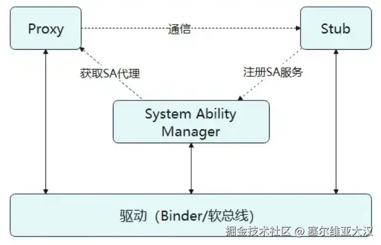 - 获取 SA 通过 SA 的标识和设备 NetworkId,从 SAMgr 获取 Proxy,通过 Proxy 实现与 Stub 的跨进程通信。