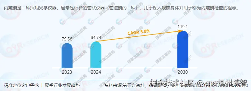 内窥镜(Endoscopy Device)是一种通过细长柔性或刚性管状仪器,结合照明与高分辨率成像技术,实现微创诊断与手术的医疗设备。根据QYResearch数据,2023年全球内窥镜市场规模达79.58亿美元,预计2030年将增长至119.1亿美元,2024-2030年复合增长率(CAGR)为5.8%。