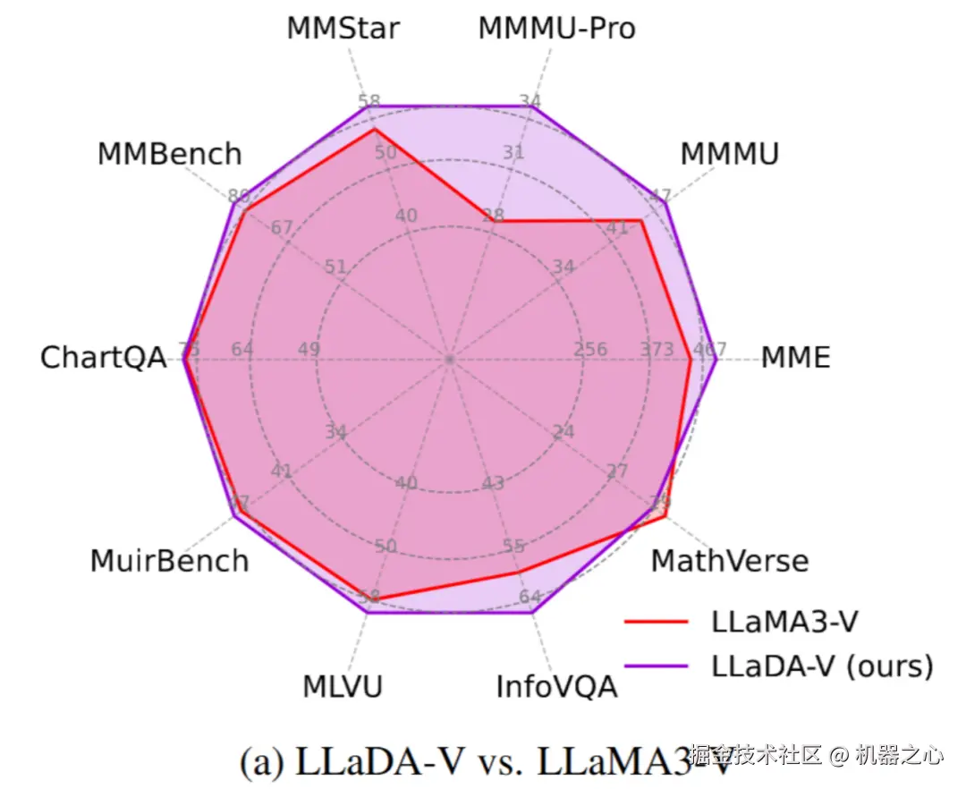 结果显示,LLaDA-V 展现出更强的数据可扩展性,特别是在多学科知识(如 MMMU)基准上。令人印象深刻的是,尽管 LLaDA-8B 在纯文本任务上略逊于 LLaMA3-8B,但 LLaDA-V 在 11 个 多模态任务中超越了 LLaMA3-V。这表明扩散架构在多模态任务上面具备一定的优势。