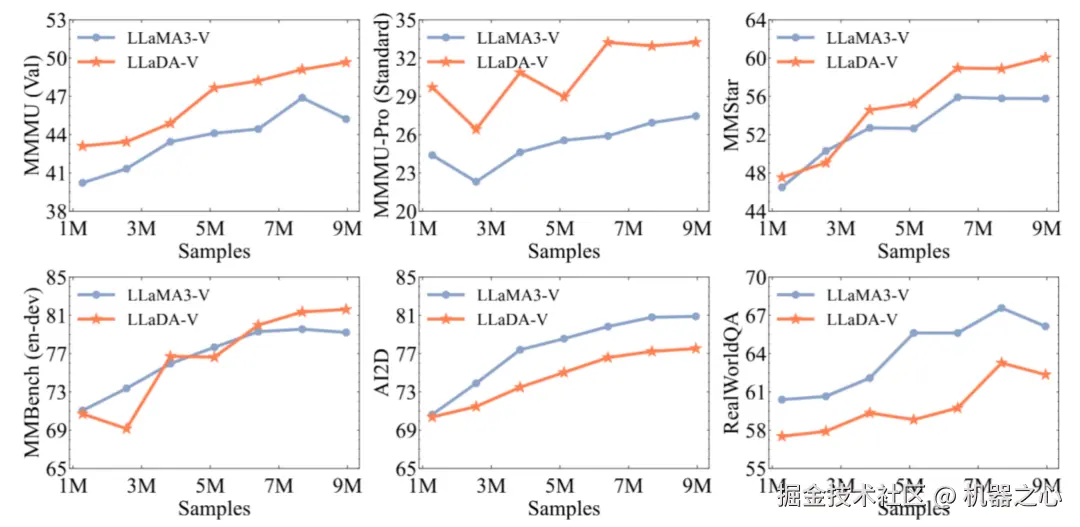 - 卓越的数据可扩展性与竞争力。团队将 LLaDA-V 与使用 LLaMA3-8B 作为语言基座、但其他部分完全相同的自回归基线 LLaMA3-V 进行了对比。
