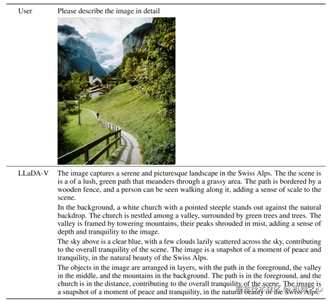 LLaDA-V 准确描述出了一幅宁静而富有层次感的瑞士阿尔卑斯山景:一条绿色小路蜿蜒延伸,一位行人沿路行走,远处是山谷中的白色教堂和被薄雾环绕的巍峨群山,蓝天白云为画面增添了宁静氛围,整体构图清晰,意境优美。