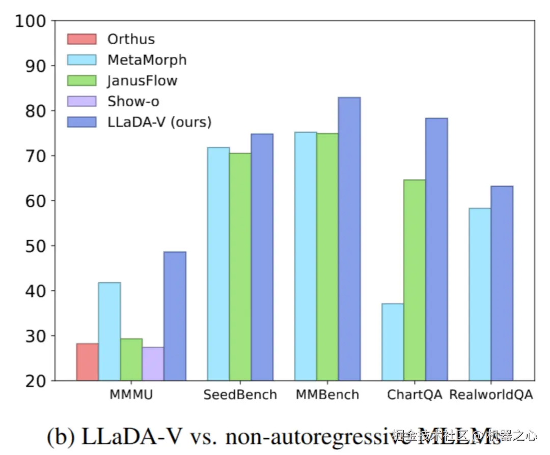 - 缩小与顶尖自回归 MLLM 的差距:尽管 LLaDA 的语言能力明显弱于 Qwen2-7B,但 LLaDA-V 在某些基准(如 MMStar)上显著缩小了与强大的 Qwen2-VL 的性能差距,达到了相当的水平(60.1 vs. 60.7)。这进一步印证了扩散模型在多模态领域的潜力。