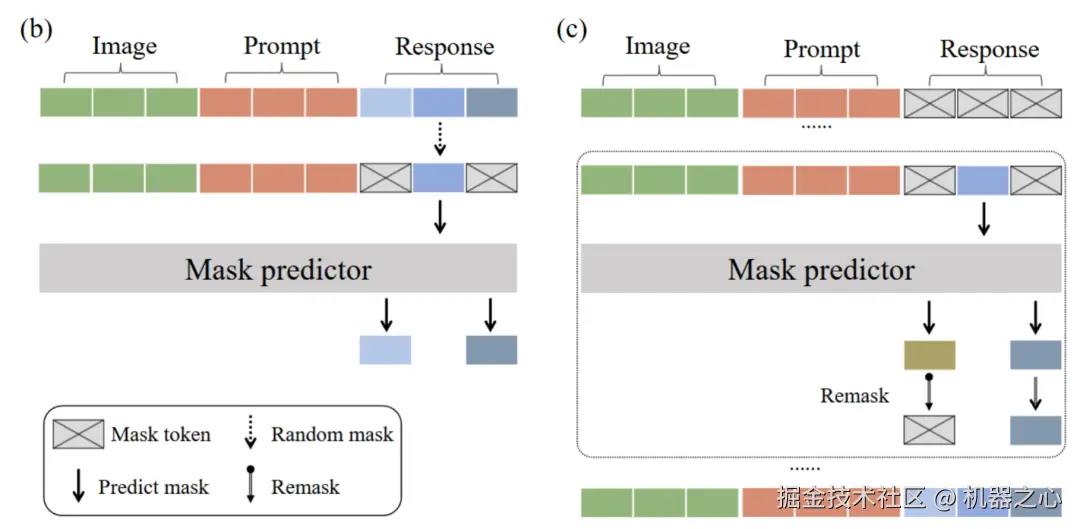 推理过程: LLaDA-V 的生成过程并非自回归式的逐词预测,而是通过扩散模型的反向去噪过程。从一个完全被掩码的回复开始,模型在多个步骤中迭代地预测被掩码的词元,逐步恢复出完整的回复。研究采用了 LLaDA 的低置信度重掩码策略,优先保留高置信度的预测,提升了生成质量。