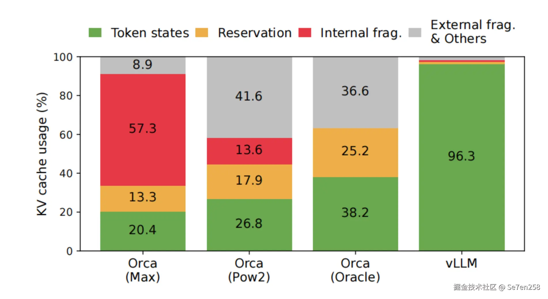 论文中的实验结果显示,再传统系统中真正用于存放 KV Cache 的有效内存占比最低仅约 20.4%,其余全为浪费。