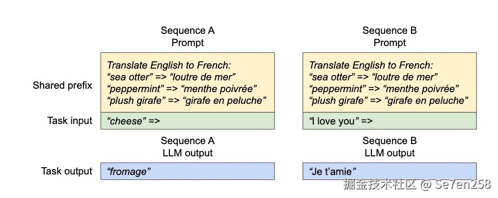 在许多提示工程实践中,多个请求会以相同的系统提示或 few-shot 示例开头(例如翻译任务中的多个例句)。这些共享前缀同样可以被 vLLM 缓存并复用。