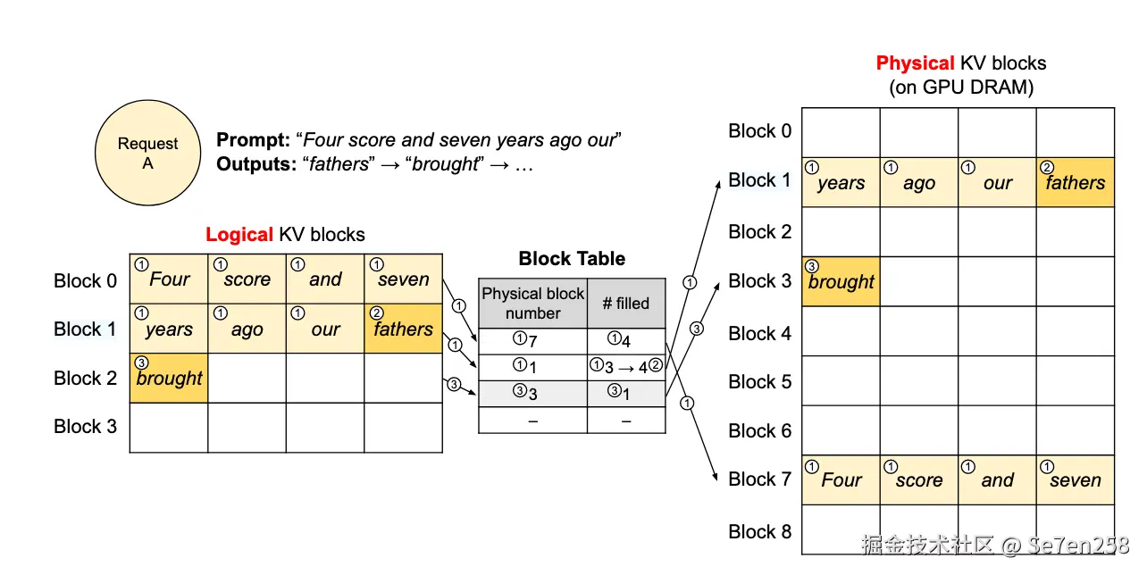 如下图所示,用户请求的 prompt 为 "Four score and seven years ago our",共包含 7 个 token: