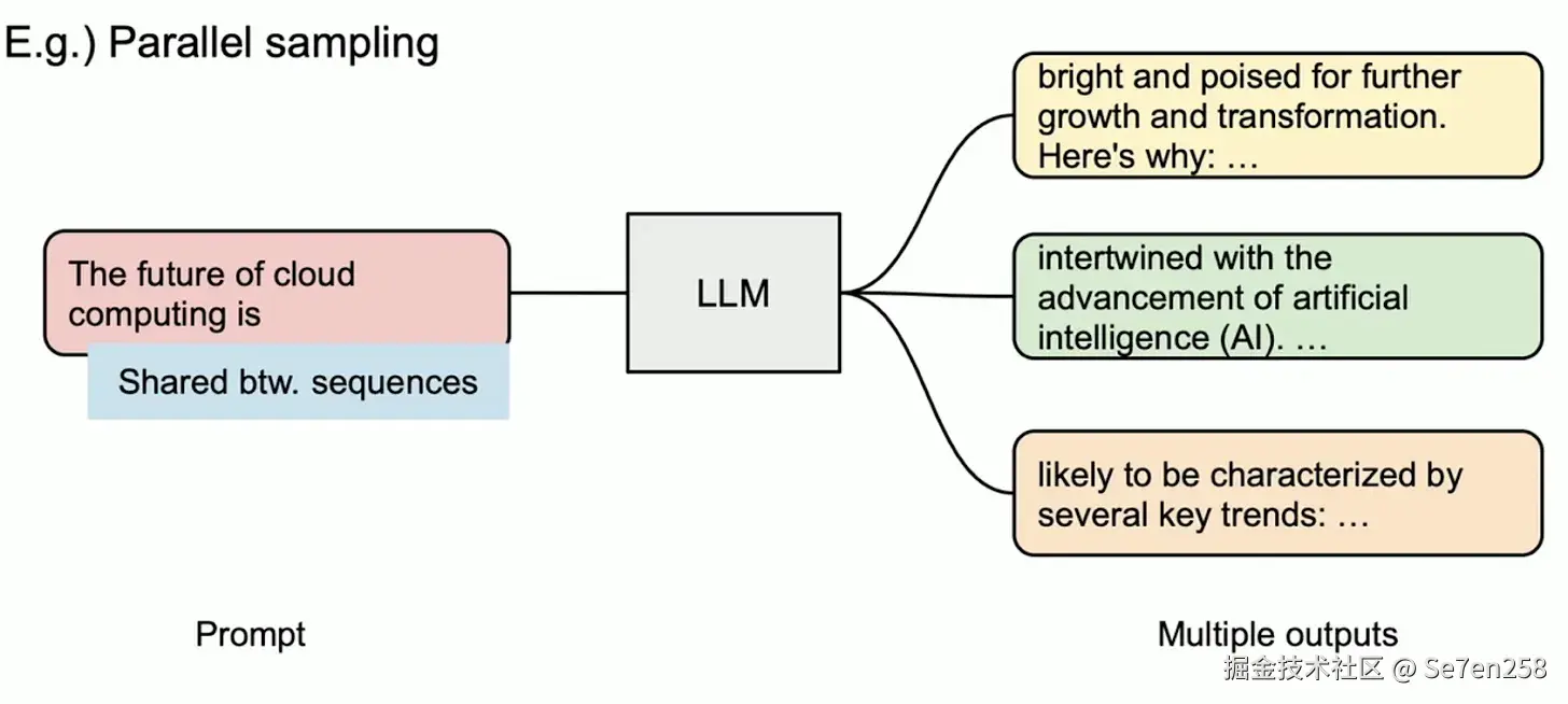 在 Parallel Sampling 中,同一个 prompt 会生成多个候选输出,便于用户从多个备选中选择最佳响应,常用于内容生成或模型对比测试。
