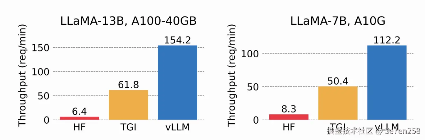 vLLM 团队将 vLLM 的推理吞吐量与 HuggingFace Transformers(HF) 和 HuggingFace Text Generation Inference(TGI) 进行了对比。评估在两种硬件设置下进行:在 NVIDIA A10G GPU 上运行 LLaMA-7B 模型,以及在 NVIDIA A100(40GB)GPU 上运行 LLaMA-13B 模型。实验结果表明,与 HF 相比,vLLM 的吞吐量最高可达 24 倍,与 TGI 相比,吞吐量最高可达 3.5 倍。