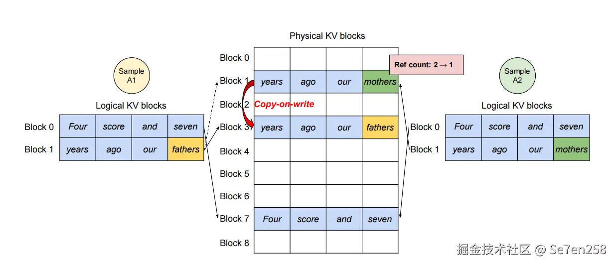 在 vLLM 中,这些采样序列共享相同的 prompt,其对应的 KV Cache 也可以共用同一组物理块。PagedAttention 通过引用计数和 block-level 的 copy-on-write 机制实现共享与隔离的平衡:只有当序列出现不同分支时,才会触发复制操作。