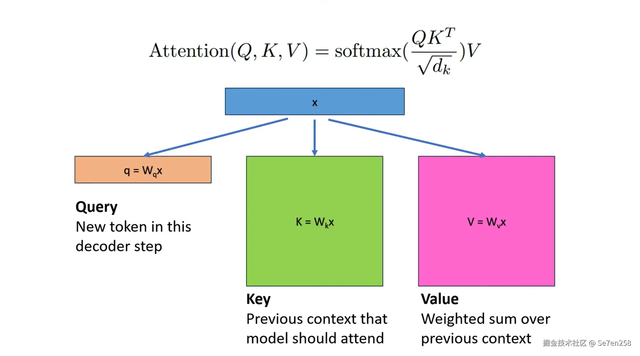 在 self-attention 中,模型为每个 token 计算三个向量:Query(Q)、Key(K) 和 Value(V)。每生成一个新 token,模型会将当前的 Query 向量与之前所有 token 的 Key 向量进行点积计算注意力分数,再据此对 Value 向量做加权求和。这种计算需要频繁访问此前的 token 信息。