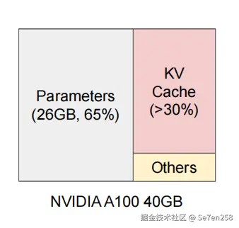 下图展示了一个 13B 参数规模的大语言模型在 NVIDIA A100 40GB 显存 GPU 上推理时的显存使用分布。其中: