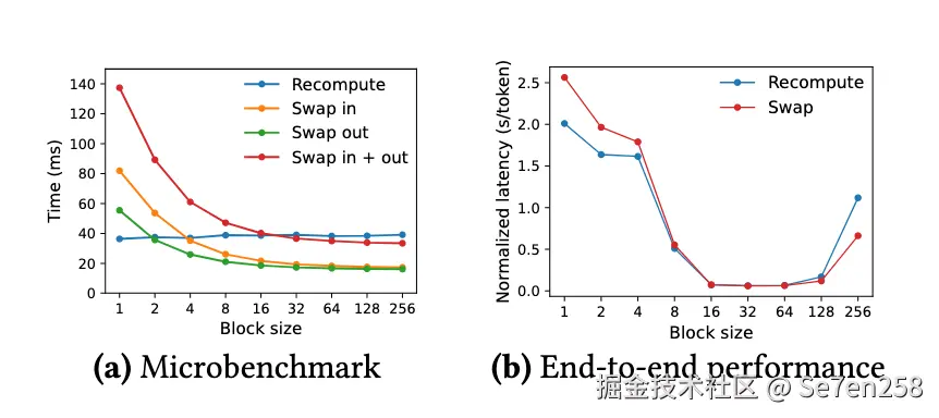 根据论文中的实验结果,Swapping 更适用于 block size 较大的场景,而 Recomputation 则在不同 block size 下的表现更为稳定。在中等 block size(16 到 64)范围内,两种方式的端到端性能基本相当。