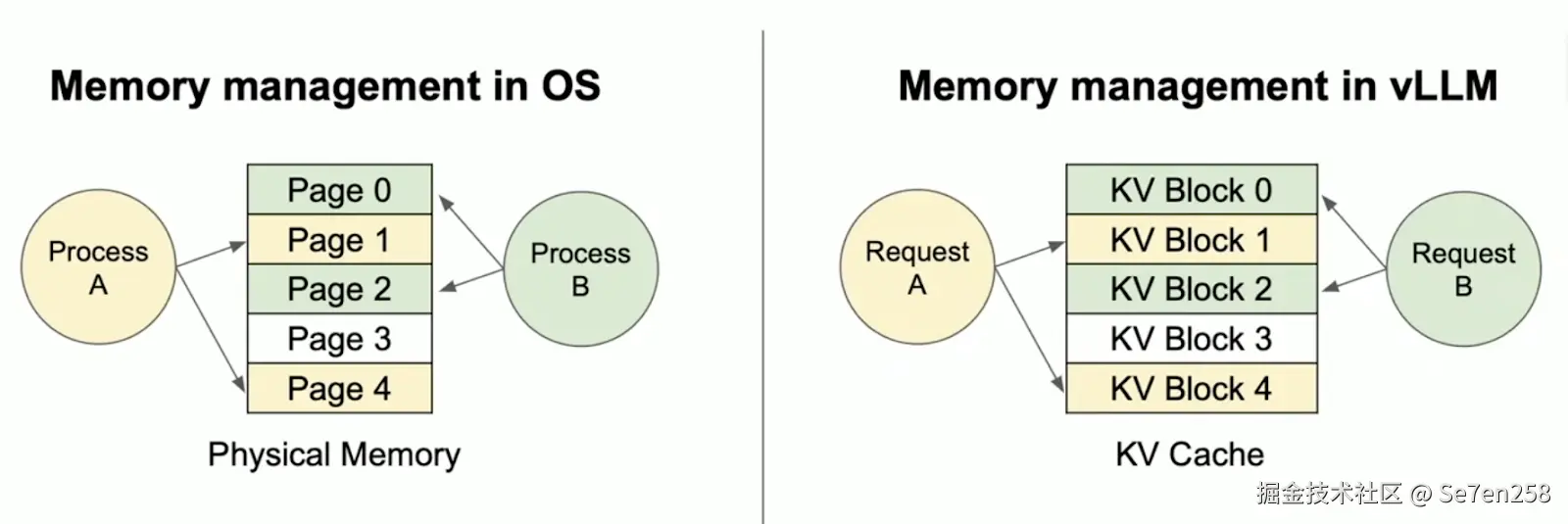 为了解决 KV Cache 内存管理中的高占用、严重碎片和复用困难等问题,vLLM 提出了一种全新的注意力机制 —— PagedAttention。它的核心思想,借鉴自操作系统中广泛应用的虚拟内存分页机制(Virtual Memory & Paging)。