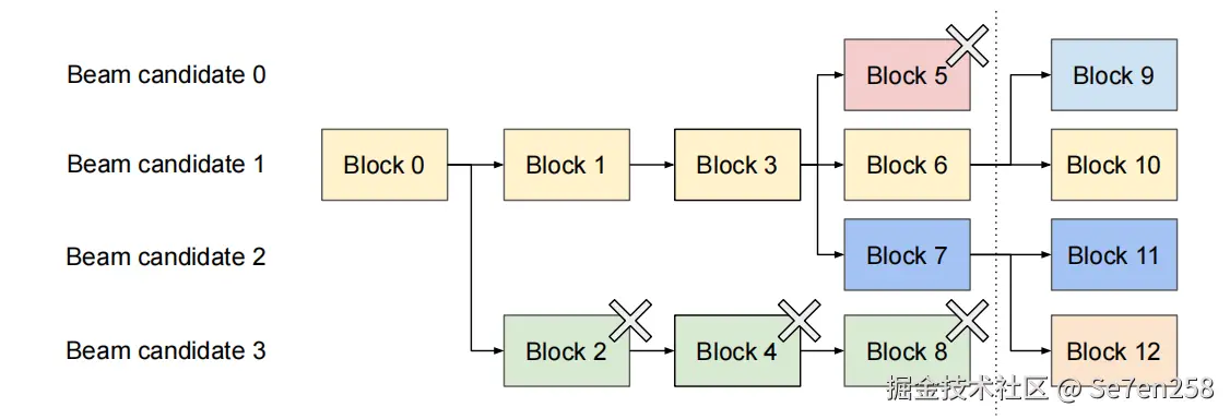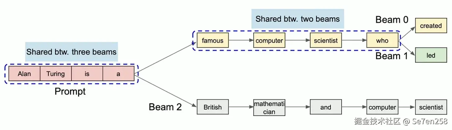在 vLLM 中,多个 beam 可以共享公共前缀部分的 KV Cache,不仅包括输入 prompt,还包括生成过程中的公共前缀 token。只要这些 beam 的生成路径尚未分叉,它们就会复用相同的物理块。当路径分叉发生后,vLLM 才通过 copy-on-write 机制对共享块进行拆分,从而保证每个 beam 的独立性。
