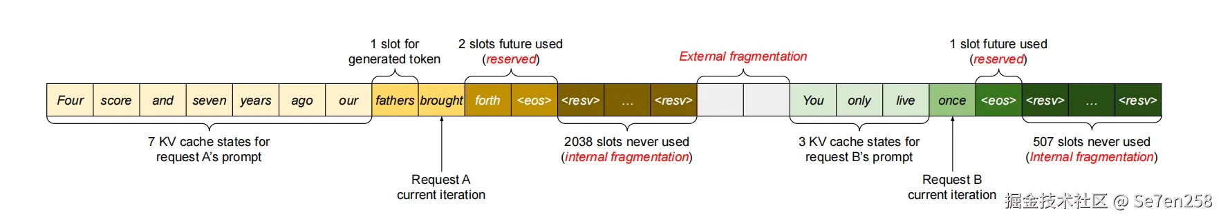 - 内部碎片(Internal Fragmentation):实际 token 数小于预留长度,剩余空间浪费。