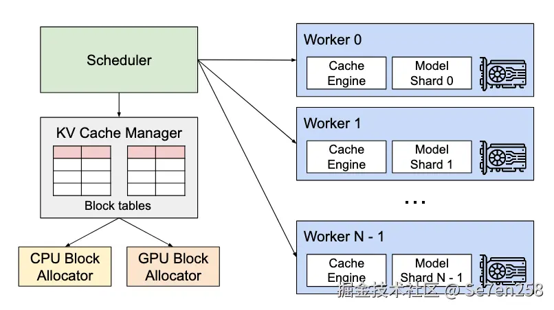 为应对这一挑战,vLLM 构建了一套面向分布式推理的执行架构,原生支持 Megatron-LM 风格的张量并行策略,并通过统一调度与基于分页的 KV Cache 管理机制,实现了跨 GPU 的高效协同推理与资源共享。