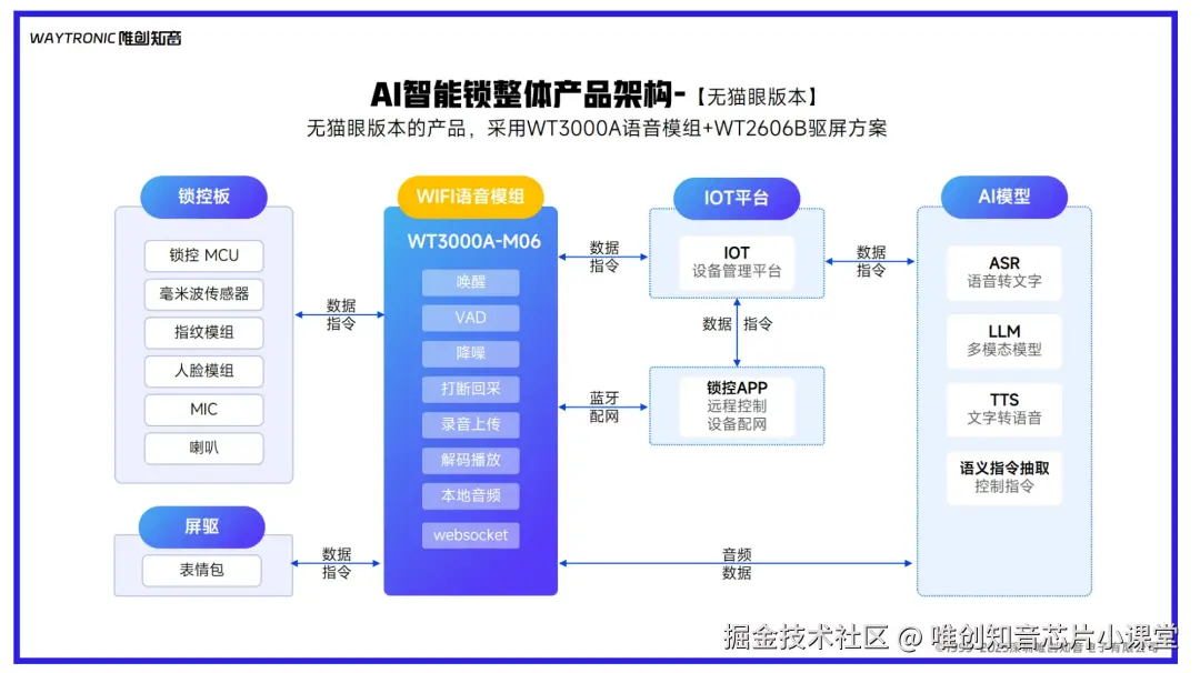 我们可以把这个过程比作人类的听觉系统:当声音进入耳朵后,需要经过大脑的处理才能理解其含义并作出反应。在智能锁中,WT2606A语音芯片就像是专门处理声音的"小助手",它能进行本地唤醒、语音活动检测(VAD)、打断处理等基础工作;而当需要更复杂的语义理解时,声音信号则会通过WIFI传输到云端,由强大的AI模型进行处理,然后将结果返回给智能锁。