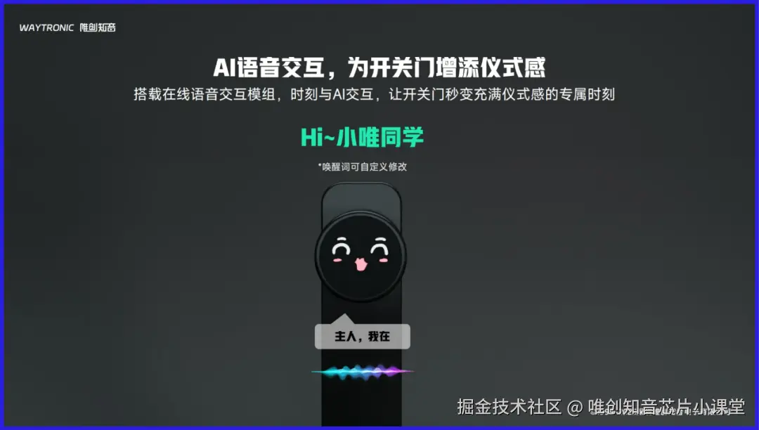 这就是唯创知音AI语音解决方案的独特魅力所在。想象一下,当你拖着疲惫的身体回到家,只需说一句"Hi~小唯同学"(唤醒词可自定义),你的门锁就能亲切地回应,甚至根据天气情况贴心提醒你"今天有雨,出门记得带伞",或在特殊节日送上专属祝福——这种体验,是不是立刻为回家增添了几分期待和温馨?
