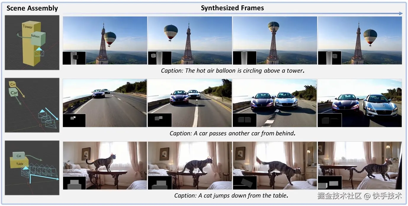 近期,可灵研究团队在「3D 感知可控视频生成」领域做出了首次尝试,推出了电影级文本到视频生成框架 CineMaster,允许用户在提供全局文本描述的基础上,通过提出的交互式工作流辅助用户像专业导演一样布置场景,设定目标与相机的运动,指导模型生成用户想要的视频内容。目前该论文已录用于 SIGGRAPH 2025。