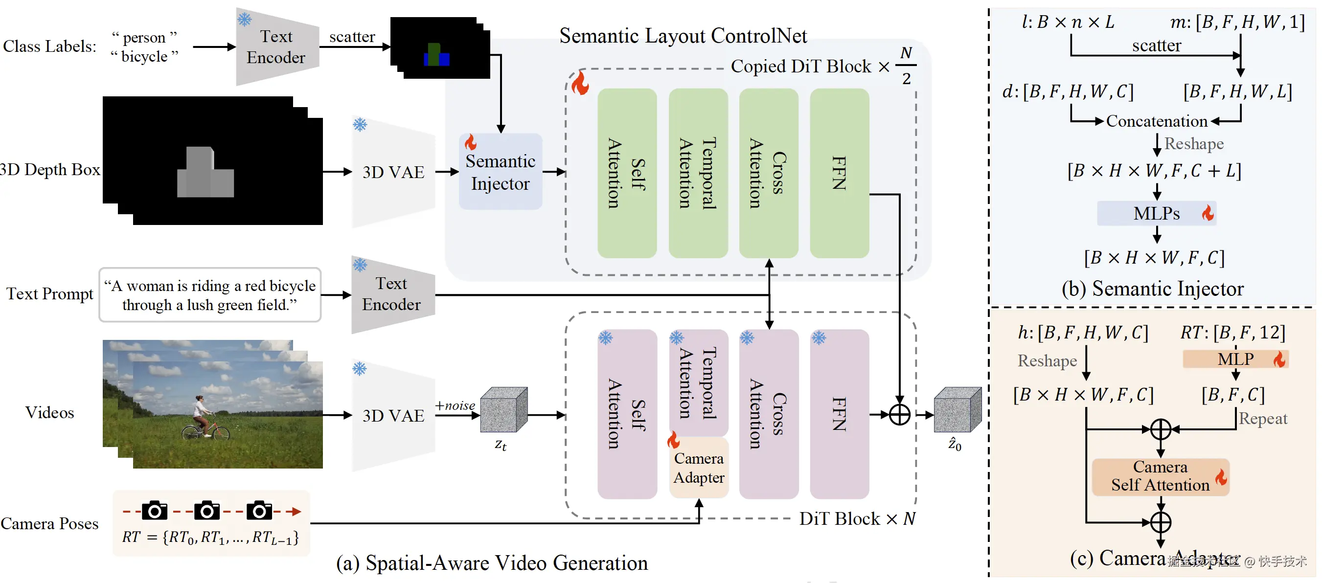 阶段2:如图所示,该方法框架通过语义布局ControlNet的架构集成了物体的运动控制信号和物体的类别标签信息,从而明确地控制每个目标的运动。此外,通过Camera Adapter集成了相机运动控制信号表示视频序列的全局运动。