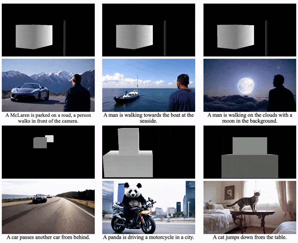 阶段1:构建3D感知的控制信号:用户可以通过交互式界面在 3D 空间中调整物体的边界框(3D Bounding Box)和摄像机位置,这个过程类似于真实的电影拍摄过程,即导演多次调整演员在场景中的排布和相机的运动。随后,导出相机轨迹和每帧的投影深度图,作为后续生成的条件信号。
