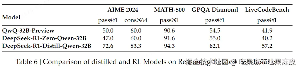 - 蒸馏可将「大模型的推理轨迹」直接转移给小模型,小模型只需要模仿大模型相对完备的推理流程,可以在较小训练/推理开销下取得远胜于自身独立强化学习的效果。