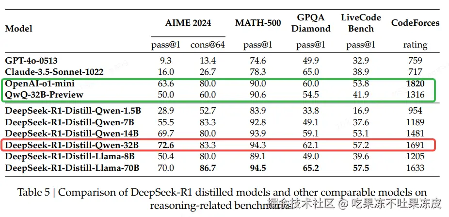 - 蒸馏后的 Qwen-32B 和 Llama-70B 在大多数基准测试中均显著优于 o1-mini。