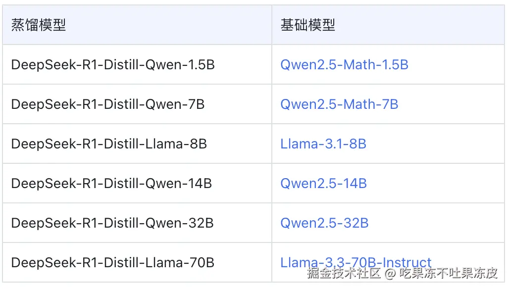 为了获得更高效的小模型,并使其配备像 DeekSeek-R1 的推理能力,直接对 Qwen 和 Llama 等开源模型进行了微调,使用的是上面用于 SFT DeepSeek-R1 的80万数据。使用的基座模型有: