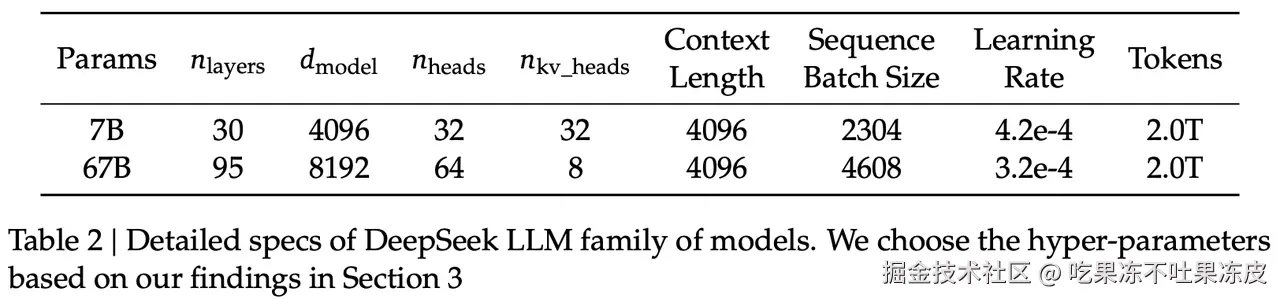 从宏观上讲,DeepSeek LLM与LLaMA略有不同。具体来说,DeepSeek LLM 7B是一个30层的网络,而DeepSeek LLM 67B有95层。层的调整不仅保持了与其他开源模型的参数一致性,还便于模型的流水线分割,从而优化训练和推理过程。与大多数使用GQA的工作不同,在67B模型中通过增加网络深度而不是常见的扩展FFN中间层宽度来扩展参数,以实现更好的性能。