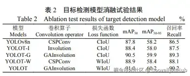 为进一步验证特征提取模块 GAInvolution 算子和目标检测网络设计的有效性,以及 WIoU 引入对番茄目标检测任务的适用性,开展模型消融试验。