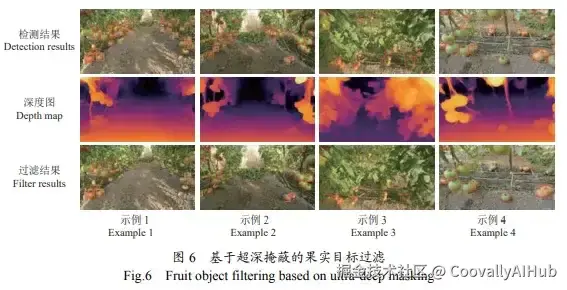 对本研究番茄计数方法框架中 YOLOT 的果实目标检测结果、DAM 的深度估计结果,以及基于深度的目标超深掩蔽结果进行可视化,部分样本的可视化结果如图 6。