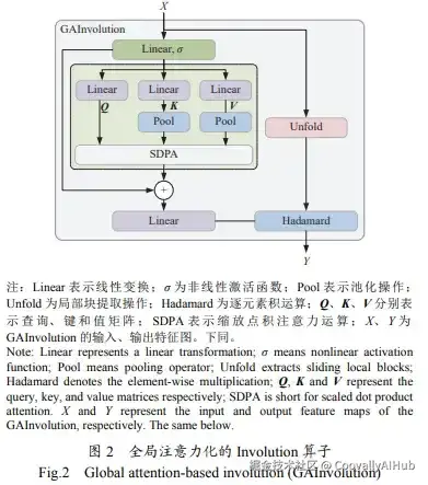 - 特征提取模块设计: 本研究在卷积核生成过程中,通过应用 Transformer 的多头注意力(multi-head selfattention,MHSA)机制,在卷积核中引入并融合输入特征图的全局信息。同时为降低 MHSA 的运算量,用池化操作对键值矩阵进行降维。将重新生成的空间异质卷积核应用于 Involution 算子。卷积核融合了全局环境信息,具有全局注意力机制,并通过 Hadamard 运算传递给计算结果。将重新设计的 Involution 算子称为全局注意 力 化的 Involution( global attention-based involution,GAInvolution),该算子的整体结构见图 2,将其作为主要的特征提取模块,用于模型骨干网络设计。