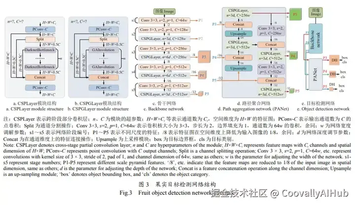 - 模型骨干网络设计: 用 GAInvolution 算子取代YOLOv8 骨干网络CSPConv层(CSPLayer,图 3a)的 DarknetBottleneck 残差模块,构成新的特征提取层,命名为 CSPGLayer(图 3b),其中 n 和 C 为超参数,分别表示 GAInvolution 算子的堆叠层数和CSPGLayer 特征图通道数。由于GAInvolution算子的引入,CSPGLayer 具有了全局环境信息融合能力。用于 CSPGLayer,按 YOLOv8 网络架构,重新构建骨干网络,结构如图 3c,其中超参数 d 用于调节网络深度,超参数 w、r 用于调节网络宽度。由于 CSPGLayer 已具有全局环境信息获取能力,因此本研究骨干网络末端不再用单独的 SPPF 层来融合环境信息。同样用CSPGLayer 重新构建 PANet,在输出特征图中融合不同尺度的特征,结构如图 3 d。用重新设计的骨干网络和PANet 构建目标检测网络,结构如图 3e,其中目标检测头则用与 YOLOv8 相同的解耦检测头(decoupled head,DH)。DH 基于网络输出的不同尺度特征,实现果实目标位置及类型的预测。