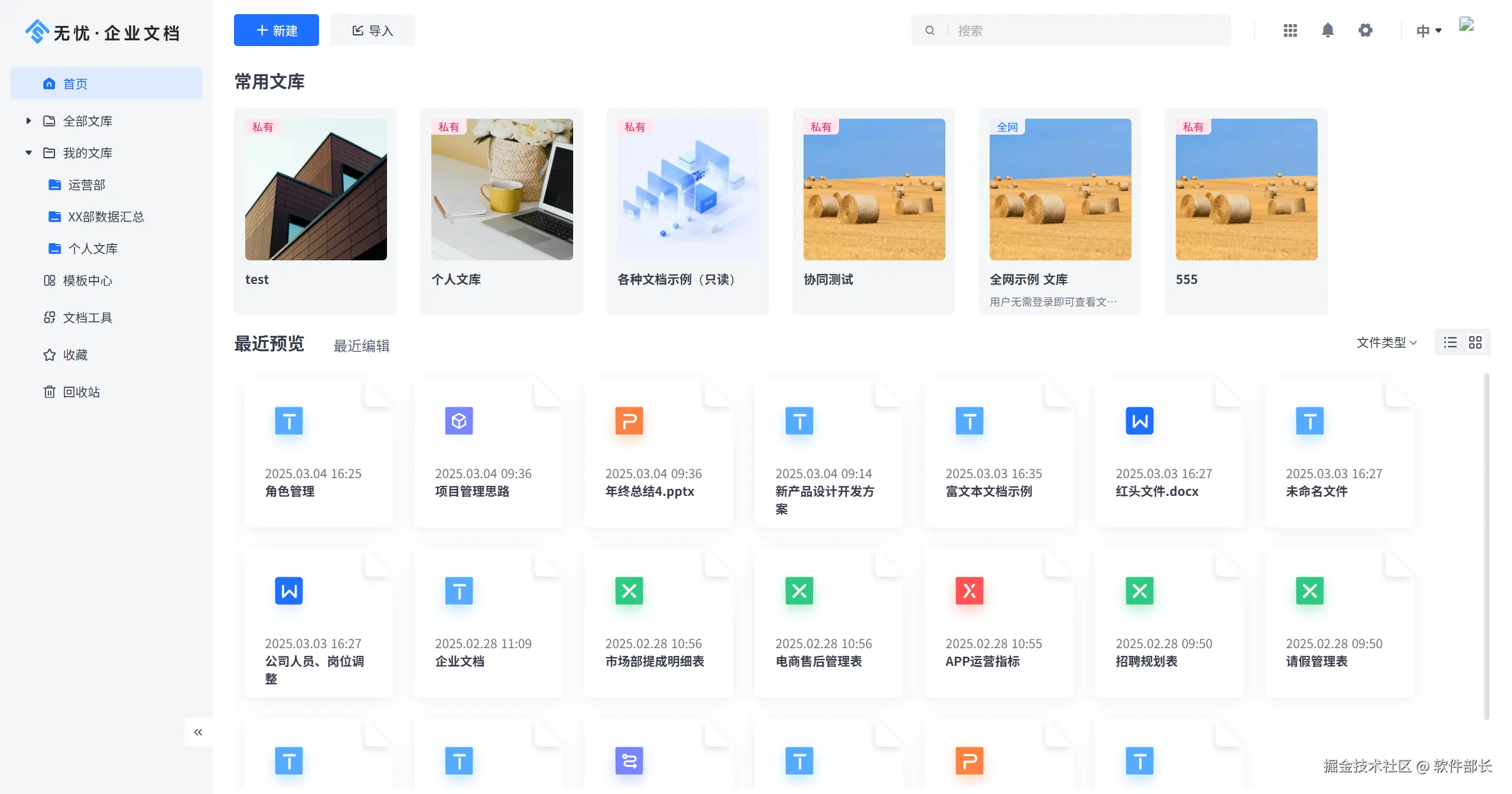 **✅ 无忧·企业文档:**有免费开源版和丰富的商业版。针对企业用户的私有化部署在线文档、协同编辑、知识管理的基础化办公工具,支持多人在线同步编辑,支持多种文件格式,如文本文档、表格文档、脑图文档、MarkDown、XMind、脑图、word、Excel、PPT和流程文档等;支持在线收集表单、思维导图、流程图等;同时支持文件上传(在线预览和二次编辑)、下载、分享、点赞、评论等等丰富功能。