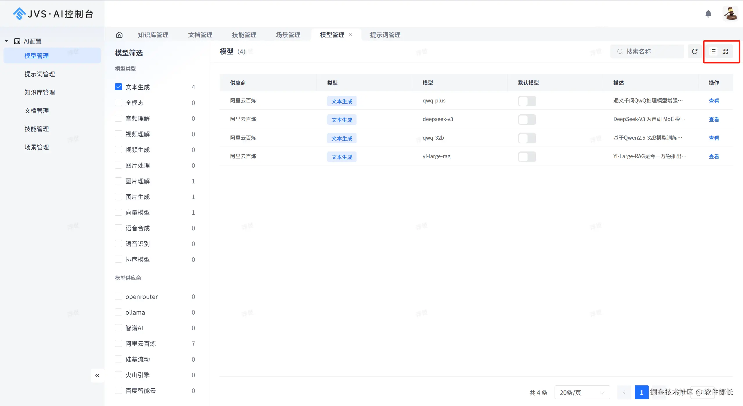 1、重构模型管理界面,支持多种模型的接入,支持互联网、本地私有化部署的模型。优化用户交互操作的体验,可以通过左侧的分类类型对右侧的模型进行过滤,如下图所示: